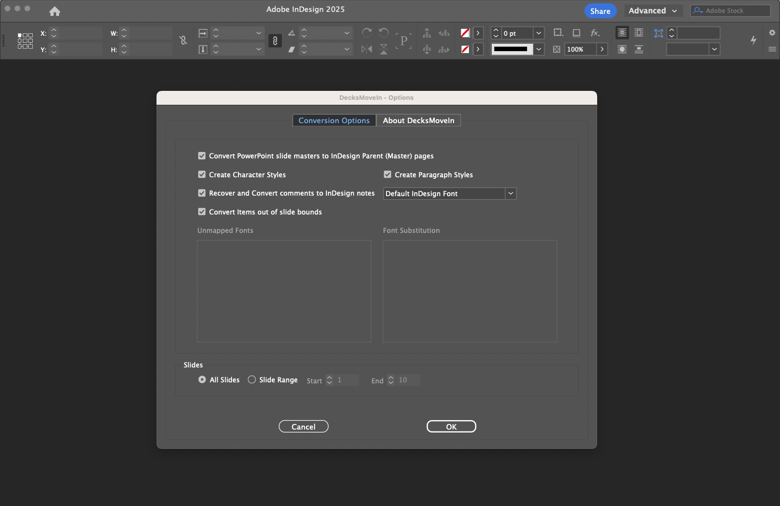 DecksMoveIn plug-in imports Microsoft PowerPoint documents into InDesign. Each slide from the PowerPoint file is converted to an accurate InDesign page that is fully editable. Canva, Google Slides, Apple Keynote, FIGMA data can be migrated and imported via the PowerPoint file type using the DecksMoveIn plug-in.